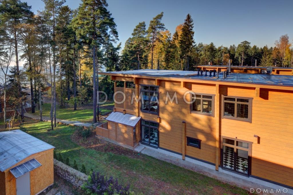 Почти половину первого этажа занимает гостиная площадью 51 кв.м и кухня-столовая с выходом на террасу. Выделена зона с сауной и комнатой отдыха. Сразу около входной двери расположена комната, в которой будет удобно сделать гостевую спальню. Вспомогательные помещения включают в себя котельную, постирочную, гардероб, 2 санузла. На втором этаже размещены 3 спальни, одна из которых хозяйская с санузлом и гардеробом. В четвертой жилой комнате на этом этаже можно сделать кабинет. В спальнях есть балконы и панорамные окна.
