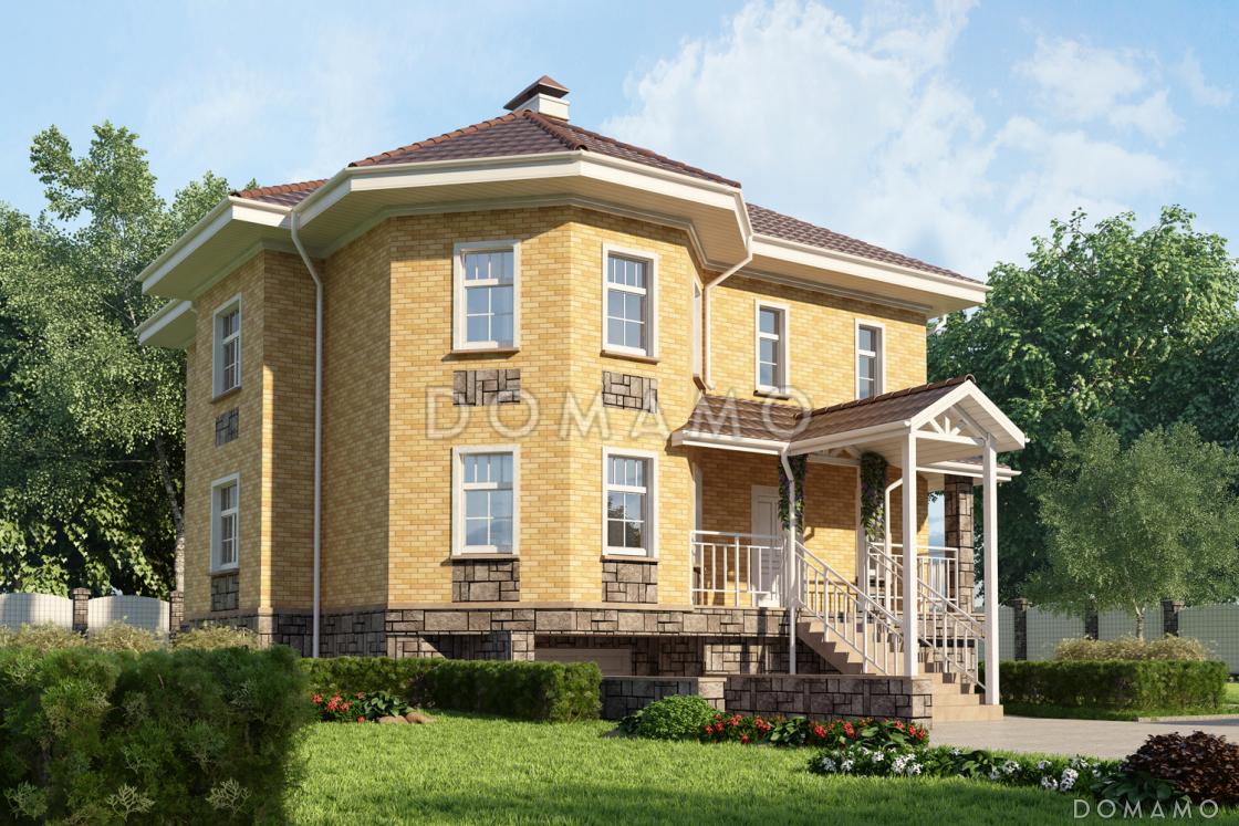 Монументальный пентхаус с подземным гаражом, по факту получается в три этажа. В цокольном находится гаражное отделение для двух автомобилей, топочная и кладовая. Высокий фундамент, выступающий эркер на два этажа, да еще использование декоративного кирпича желтого цвета наделяют постройку необычным видом. Крытое крыльцо с высокой лестницей ведет в прихожую, сбоку от нее гардеробная. Далее попадаешь в гостиную с эркером, потом идет огромная спальня со своей гардеробной, всего (34м2). Сверху 4 комнаты отдыха и ванная.