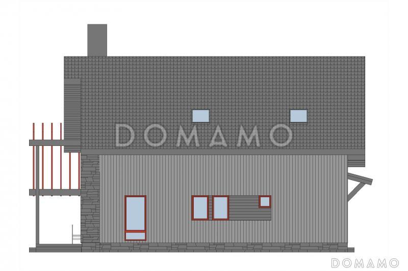 Стильный дом с четырьмя спальнями и кабинетом подойдет для семьи из 4-5 человек. Внешний вид дома интересен разнородной облицовкой и яркими акцентами. Стены частично обшиты деревянной вагонкой, частично — камнем. Фасад украшают оформленные в красном цвете оконные рамы, двери, навес над крыльцом.