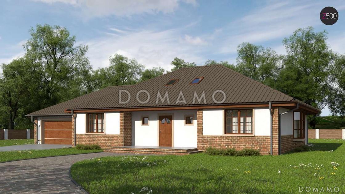 Проект одноэтажного дома из кирпича с мансардой, гаражом на два автомобиля и зоной барбекю на террасе / 1