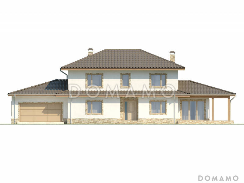 Компания Domamo предлагает проект красивого просторного двухэтажного коттеджа из кирпича с крытой террасой и гаражом D4351. Общая площадь - 264 м2, размер - 10.47х23.22 м. Фундамент - ленточный заглубленный из фбс, кровля - металлочерепица, внешняя отделка - мокрая штукатурка облицовка камнем. Для заказа проекта или внесения изменений свяжитесь с нами с помощью форм обратной связи на сайте или по телефону +7 (831) 231-05-02.