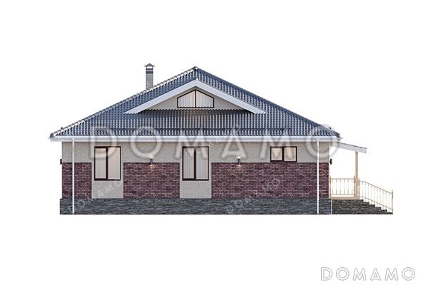 D5616 Проект одноэтажного дома с комбинированной отделкой фасадов кирпичом разных тонов, большой террасой под одной кровлей с домом и удобной планировкой для семьи с детьми