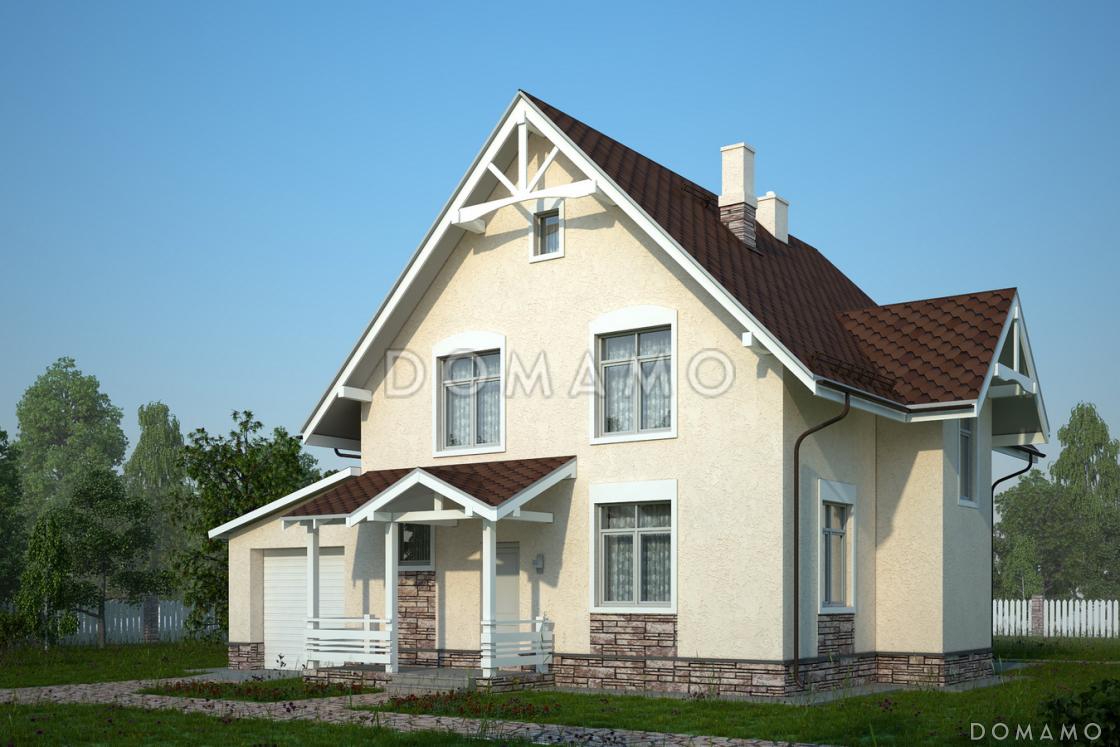 Популярный вариант компактного двухэтажного коттеджа (с мансардным этажом) рассчитанным на проживание большой семьи из четырех и более человек с пристроенным гаражом. Такая компоновка позволяет уменьшить расходы на отопление и гаража, и помещений дома, позволяет свободно посещать пристройку, не покидая пределов здания. Фактически в едином блоке удобно расположены и остальные хозяйственные помещения, занимая большую часть первого этажа здания.