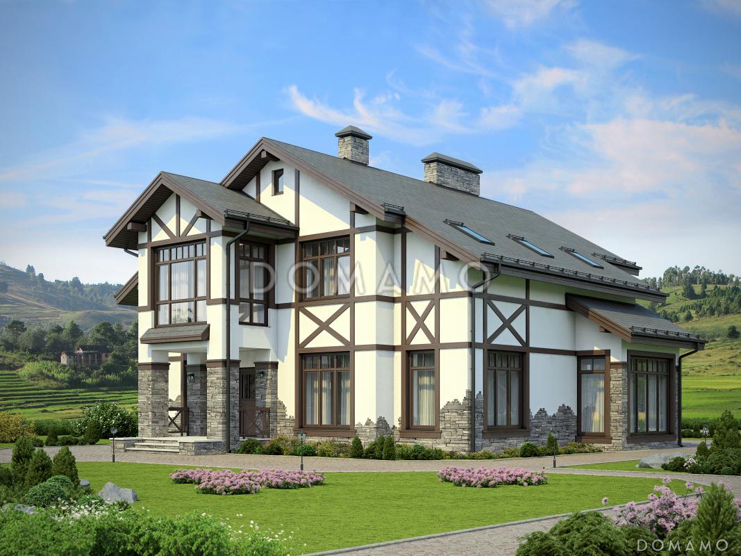 Компактный коттедж с мансардой, террасами и пятью жилыми комнатами подойдет для комфортного проживания семьи из 4-6 человек. Дом построен из газобетона, оформлен фахверковыми элементами: балками, декоративными планками, массивными ограждениями балконов и террас.