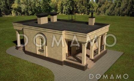 Проект бани в эклектичном стиле с колоннами, которая станет излюбленным местом для отдыха всей семьи. Экстерьер дома украшают необычная плоская крыша и большие панорамные окна.