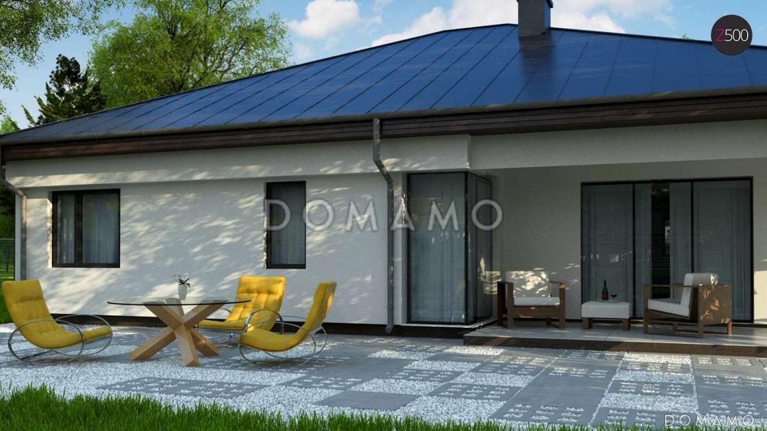 Проект кирпичного одноэтажного дома с тремя спальнями для семьи из 3-4 человек. Экстерьер дома простой, оштукатуренные стены украшают французские окна и стеклянный эркер.