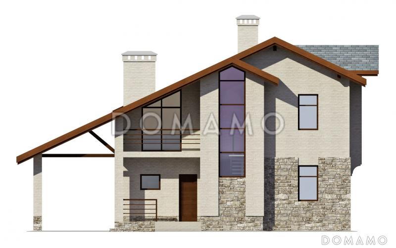 Проект коттеджа с мансардой в стиле минимализма, который отлично подойдет для жизни небольшой семьи из трех-четырех человек. Отделка из светлого кирпича, высокие панорамные окна и необычная односкатная крыша выделяют проект среди остальных. Возле дома также расположен навес с парковочным местом для одного автомобиля.
