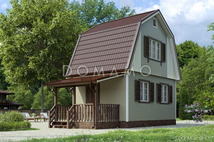 Маленький дачный домик, в нем нет ничего лишнего, только главные помещения, которые позволяют переночевать хозяевам участка и насладиться природой. Такой дом за счет своих компактных размеров и прямоугольной формы может располагаться на узких участках. Сочетание светло-серых стен, темно-серой крыши и белого крыльца, а также других элементов навевает милое восприятие этой постройки. Небольшое крылечко радушно будет встречать гостей, а за его ограждением даже поместится небольшой столик для их чаепития. Сразу от дверей спроектирована кухня-прихожая, в ней предусмотрена винтовая лестница, дальше идет спальня небольших размеров, а под крышей скрывается жилая мансарда.