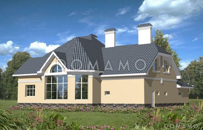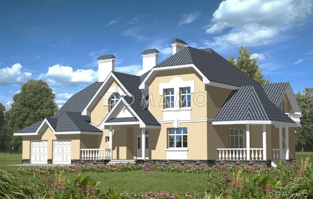 Проект просторного коттеджа с пятью спальнями для строительства загородного дома на семью из 5-6 человек. В здании предусмотрен высокий мансардный этаж с полноценными окнами и балконом.