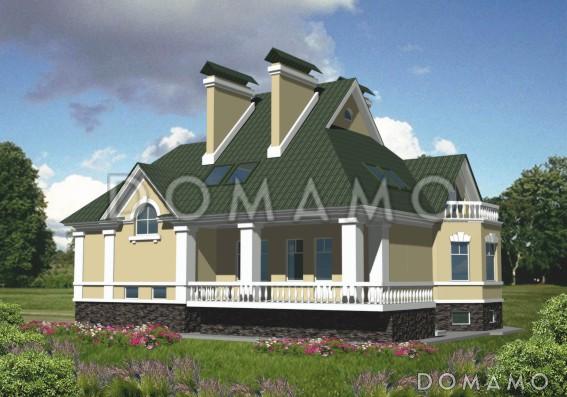 Проект просторного коттеджа с тремя спальнями и кабинетом подойдет для строительства загородного дома на семью из 4-5 человек. Здание украшают элементы классического стиля: балясины в белых ограждениях террас и балкона, квадратные колонны и пилястры.