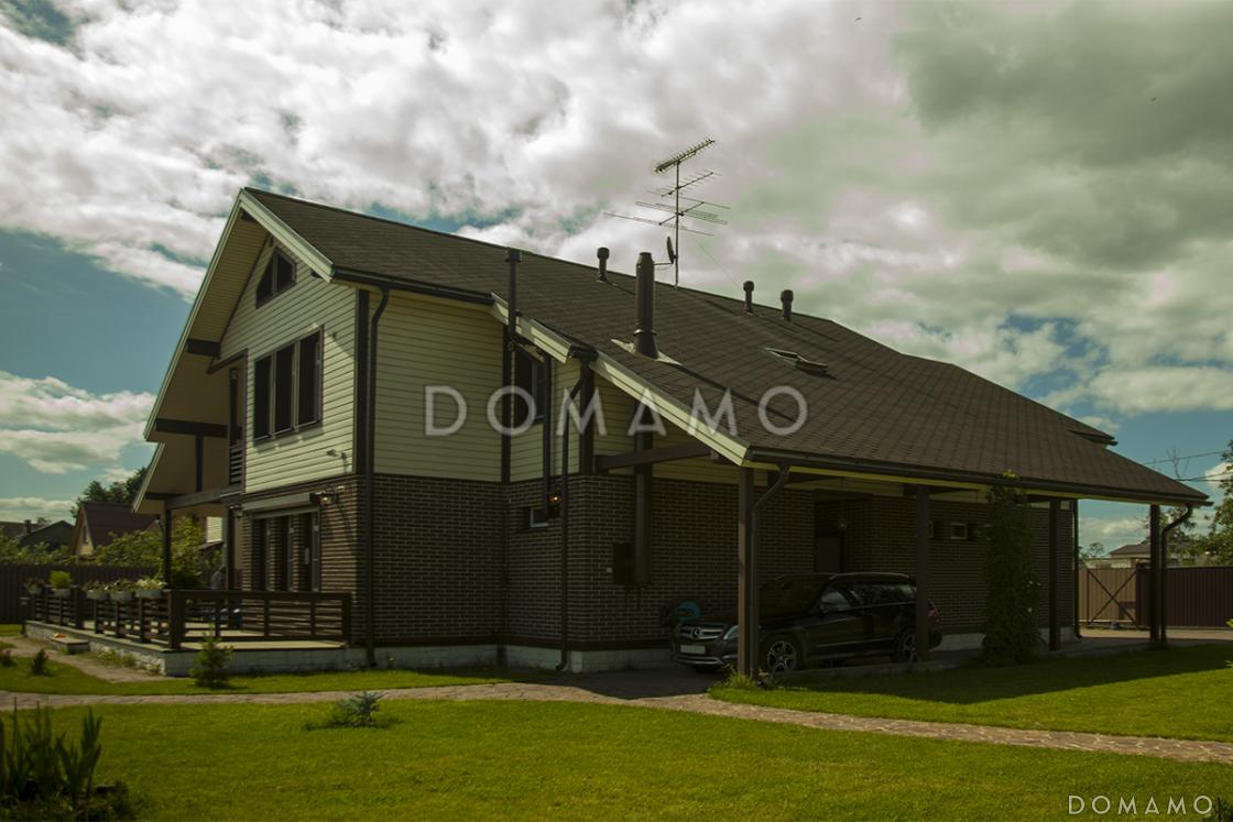 Компания Domamo предлагает проект каркасного дома с отделкой из двух материалов D360. Общая площадь - 297 м2, размер - 14.8х14.3 м. Фундамент - утепленная шведская плита (ушп), кровля - металлочерепица, внешняя отделка - облицовочный кирпич деревянная вагонка. Для заказа проекта или внесения изменений свяжитесь с нами с помощью форм обратной связи на сайте или по телефону +7 (831) 231-05-02.
