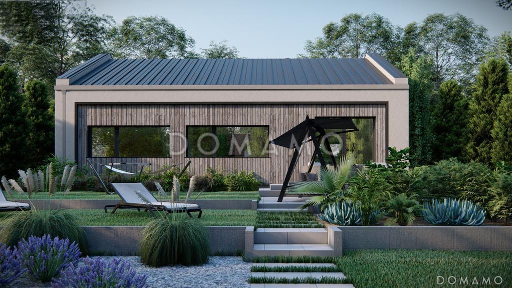 Компания Domamo предлагает проект элегантного загородного дома с помещениями на одном этаже, двухскатной крышей, тремя спальнями, кладовой на кухне D4113. Общая площадь - 85 м2, размер - 12.36х8.76 м. Фундамент - ленточный монолитный, кровля - металлочерепица, внешняя отделка - деревянная вагонка мокрая штукатурка. Для заказа проекта или внесения изменений свяжитесь с нами с помощью форм обратной связи на сайте или по телефону +7 (831) 231-05-02.