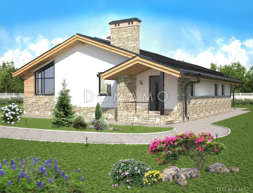 Одноэтажный дом из пенобетона с просторной кухней-столовой и тремя спальнями – это отличный вариант для комфортной жизни небольшой семьи из 3-4 человек. Симпатичное решение для оформления внешнего вида такого здания – сочетание панорамных окон и облицовки светлым камнем.