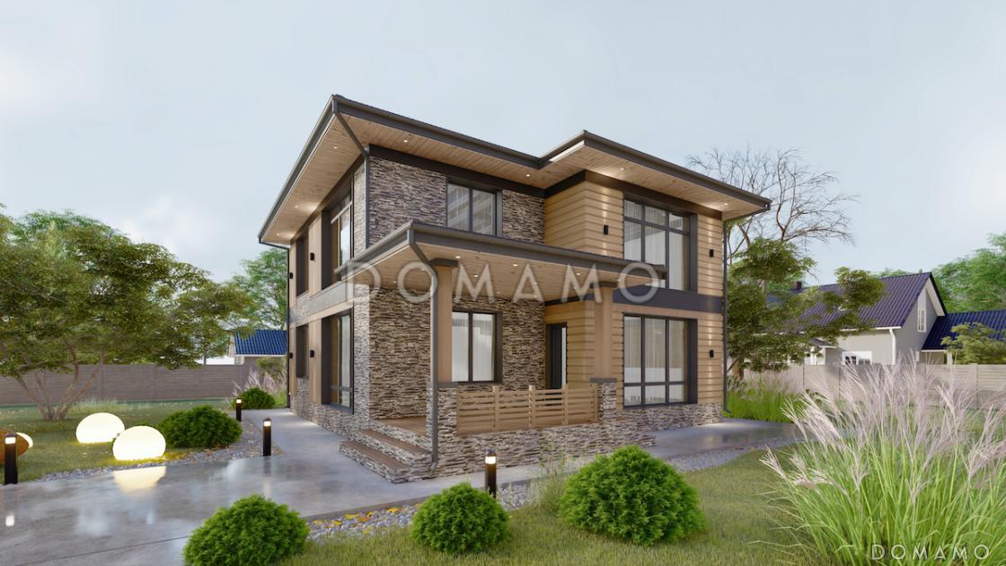 Компания Domamo предлагает проект двухэтажного дома из газобетона с окнами в пол и вторым светом D6835. Общая площадь - 153 м2, размер - 10.5х10 м. Фундамент - монолитная ж/бетонная плита, кровля - металлочерепица, внешняя отделка - фасадные панели облицовка камнем. Для заказа проекта или внесения изменений свяжитесь с нами с помощью форм обратной связи на сайте или по телефону +7 (831) 231-05-02.