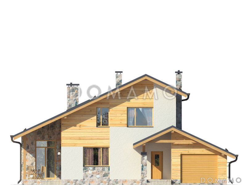 Проект небольшого коттеджа в стиле шотландского минимализма отлично подойдет для проживания в нем семьи из трех – четырех человек. Необычный облик зданию придают его планировка в совокупности со скошенной ассиметричной крышей. Часть здания облицована светлой штукатуркой, часть древесиной и натуральным камнем. На первом этаже расположена просторная гостиная, совмещенная с кухней-столовой, гостевая комната, а также гараж с парковочным местом для одной машины. Мансардный этаж отведен под три спальных комнаты.