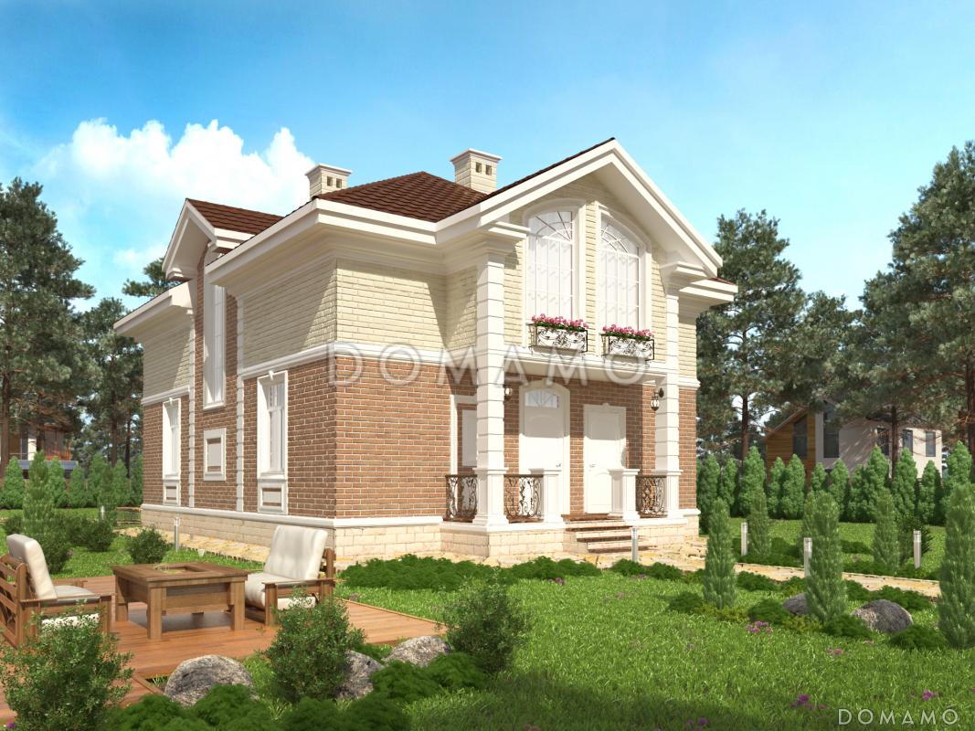 Представительная усадьба с парадным фасадом, облицованным кирпичом, декоративными украшениями и коваными ограждениями, для постоянного проживания семьи из 4-5 человек.