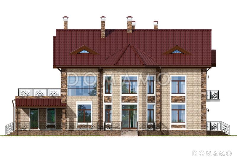 Просторный двухэтажный коттедж в немецком стиле с цоколем и мансардой, предусмотренный для постоянного проживания большой семьи из пяти — шести человек. На первом этаже дома расположена большая гостиная с наличием места под камин, объединенная с кухней-столовой. В каждом из этих помещений обеспечены выходы на открытую террасу. Здесь же спальня, отлично подходящая для старших членов семьи, а также большое пространство, отведенное под бильярдную и сауну. Второй этаж занимает просторная гостиная с выходом на лоджию с зимним садом и далее на крытую террасу. Помимо этого, на втором этаже расположены три спальных комнаты, одна из которых объединена с помещением, где можно обустроить хозяйский кабинет. Отсюда есть выход на небольшой балкон.